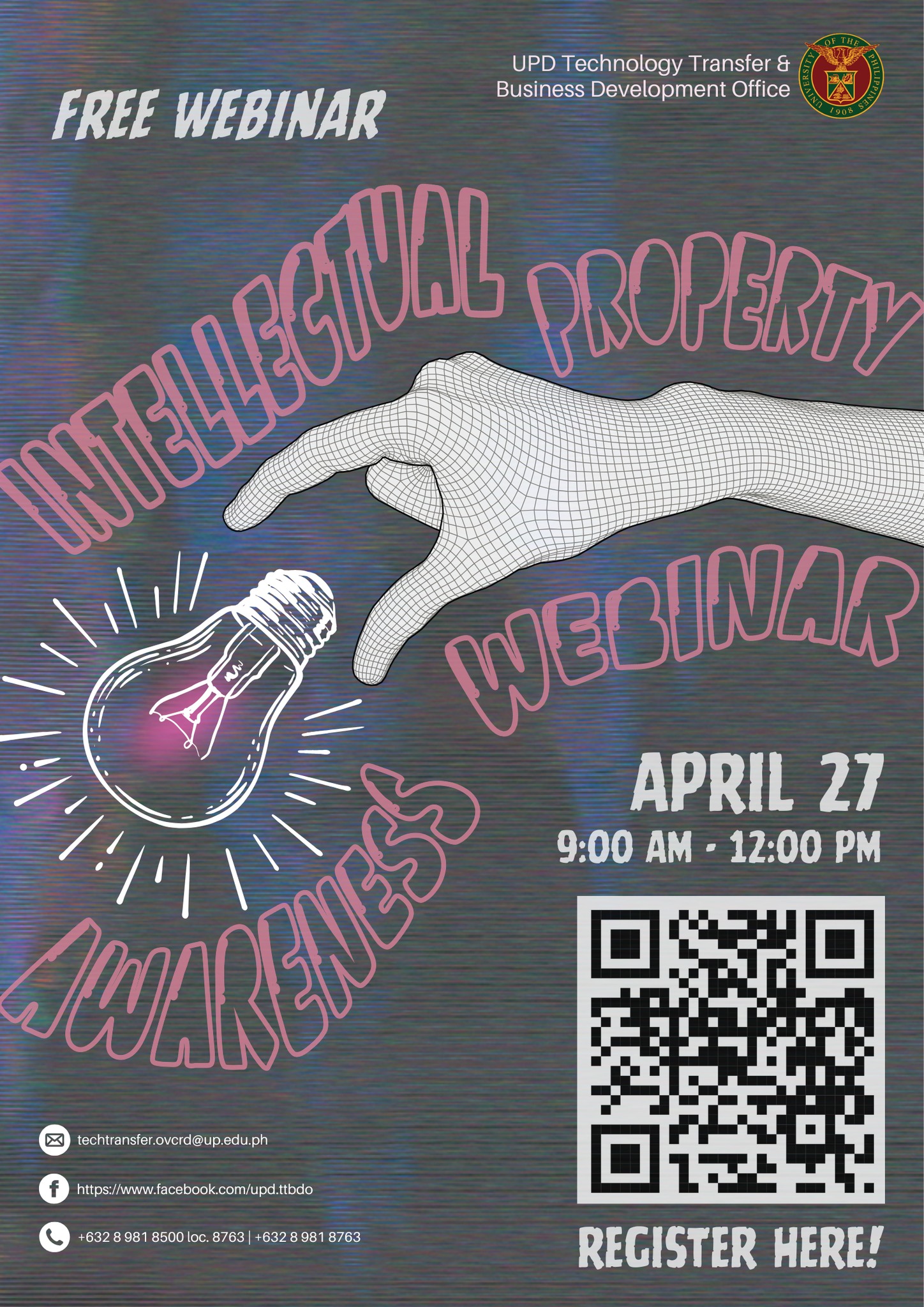 Date: Apr 27 | 9:00 AM - 12:00 PMEveryone is invited to the “Intellectual Property Awareness Webinar 2026” of the UP Diliman Technology Transfer and Business Development Office on April 27, Monday, from 9 a.m. to 12 p.m. via Zoom.