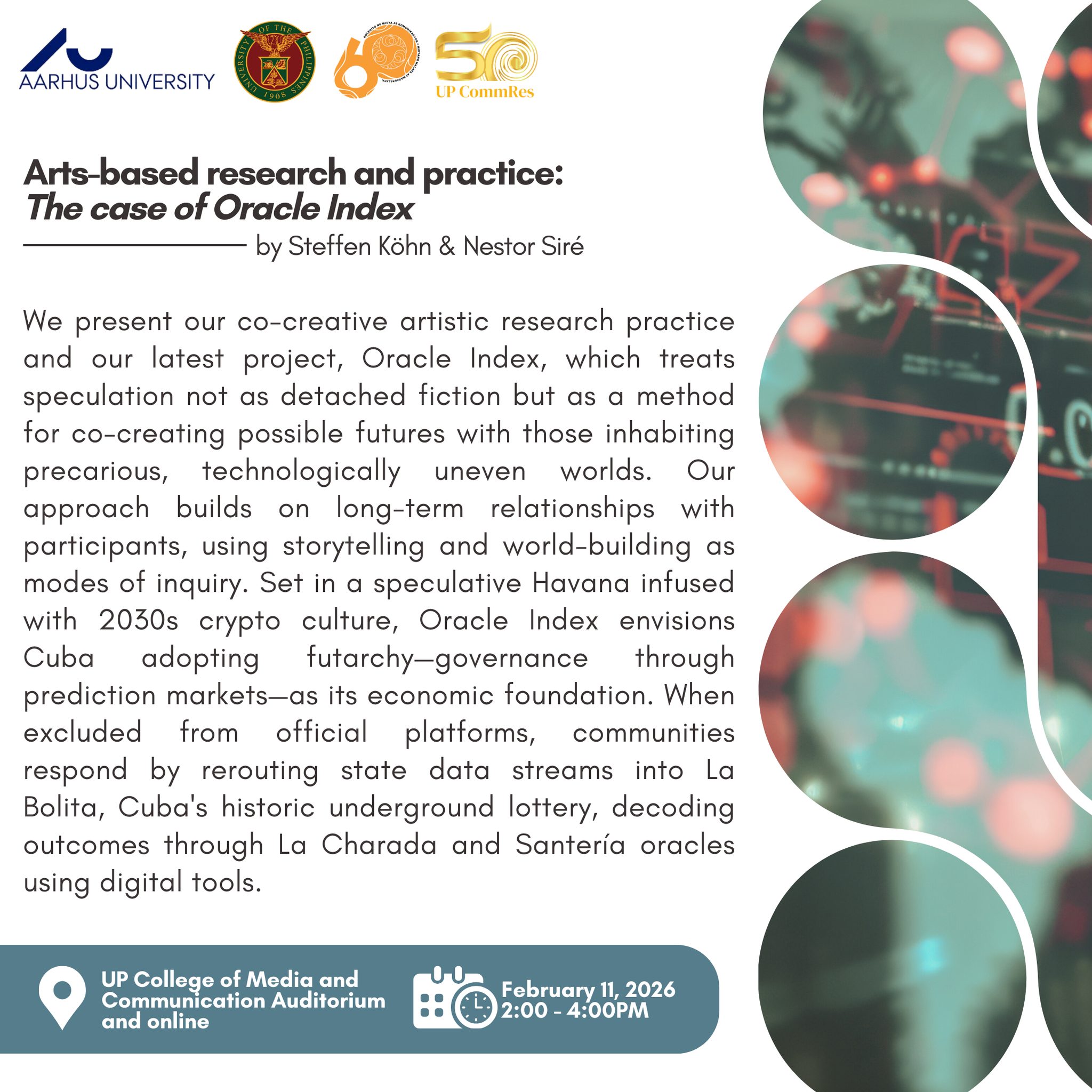 Date: Feb 11 | 2:00 PM - 4:00 PMEveryone is invited to the presentation on “Arts-Based Research and Practice: The Case of Oracle Index” by Steffen Köhn and Nestor Siré on Feb. 11, Wednesday, 2–4 p.m., at the UP Diliman College of Media and Communication (CMC) Auditorium.