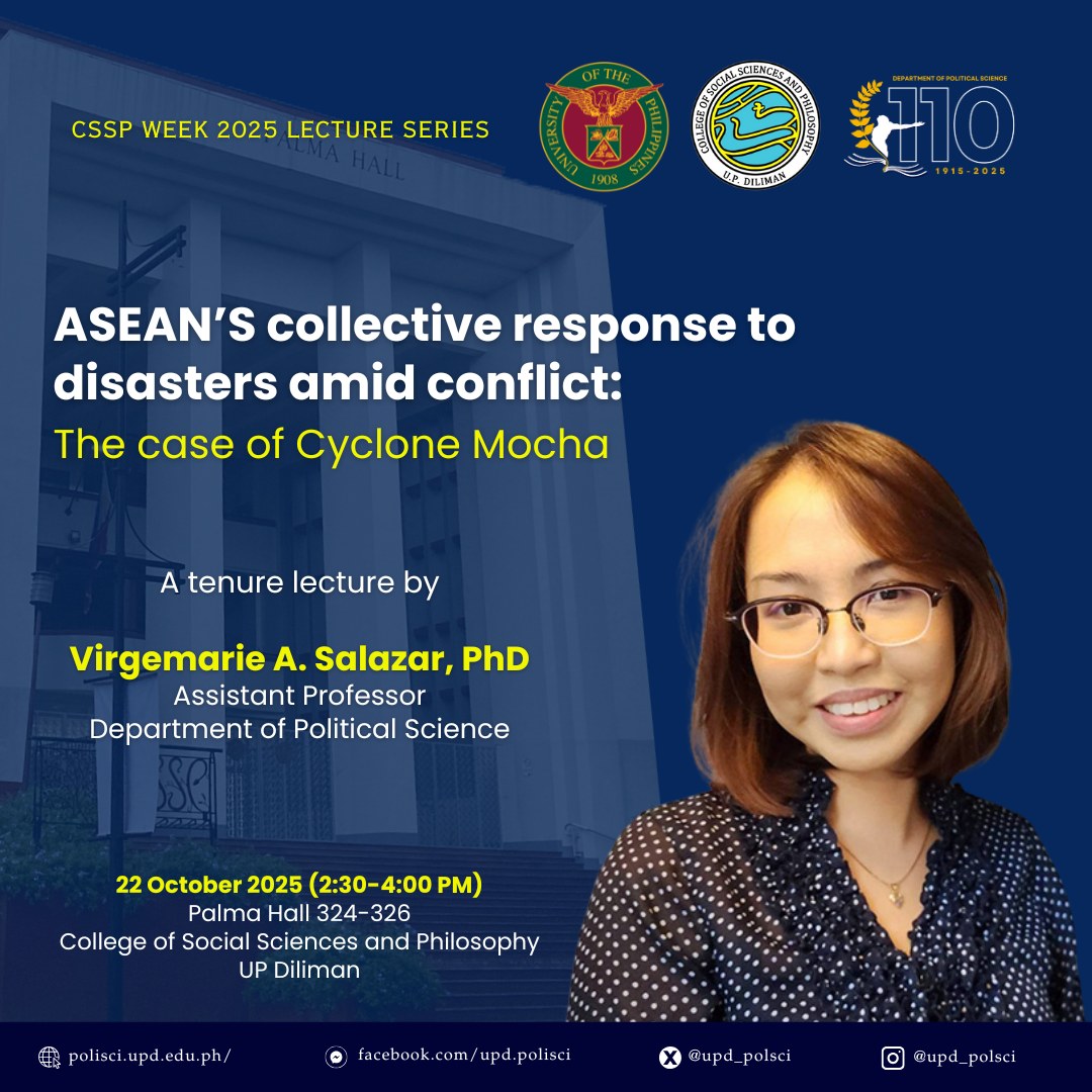 Date: Oct 22 | 2:30 PM - 4:00 PMCatch the tenure lecture “ASEAN’s Collective Response to Disasters Amid Conflict: The Case of Cyclone Mocha” on Oct. 22, Wednesday, 2:30–4:00 p.m., at Rooms 324–326, Palma Hall, UP Diliman (UPD) College of Social Sciences and Philosophy (CSSP).