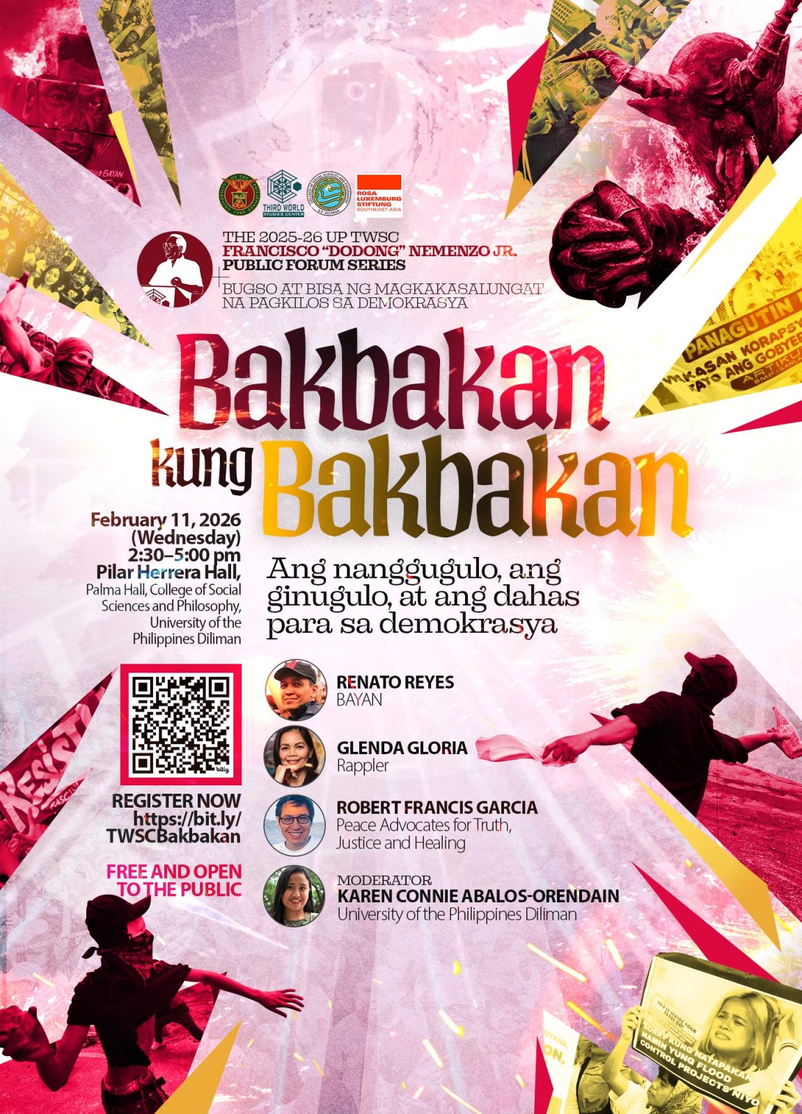 Date: Feb 11 | 2:30 PM - 5:00 PMCatch the forum “Bakbakan Kung Bakbakan: Ang Nanggugulo, ang Ginugulo, at ang Dahas para sa Demokrasya” on Feb. 11, Wednesday, 2:30–5:00 p.m., at Pilar Herrera Hall, Palma Hall, UP Diliman (UPD) College of Social Sciences and Philosophy.