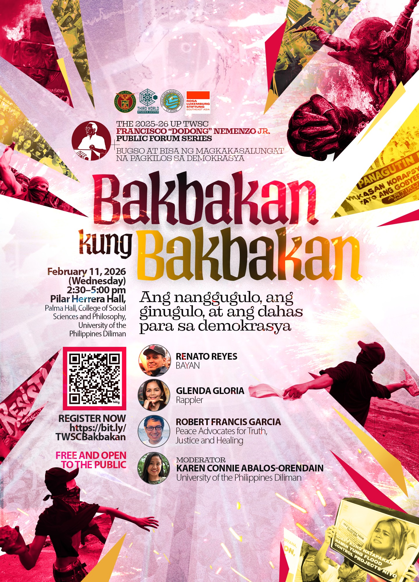 The event is organized by the UPD Third World Studies Center (TWSC) as part of its “2025–26 UP TWSC Francisco ‘Dodong’ Nemenzo Jr. Public Forum Series: Bugso at Bisa ng Magkakasalungat na Pagkilos sa Demokrasya.”