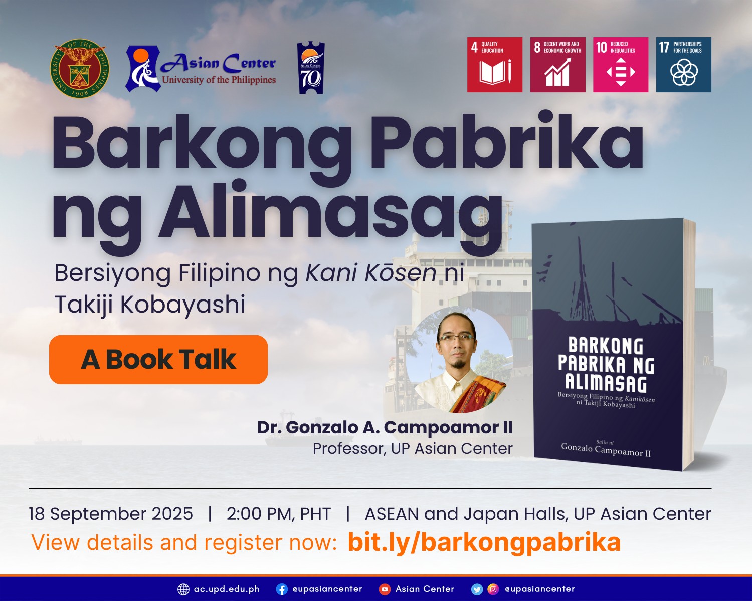 Date: Sep 18 | 2:00 PM - 4:00 PMEveryone is invited to the book talk on “Barkong Pabrika ng Alimasag: Bersiyong Filipino ng Kanikōsen ni Takiji Kobayashi” by Gonzalo A. Campoamor, PhD, a professor at the UP Diliman Asian Center (AC), on Sept. 18, Thursday, 2 p.m., at the ASEAN and Japan Halls, AC.