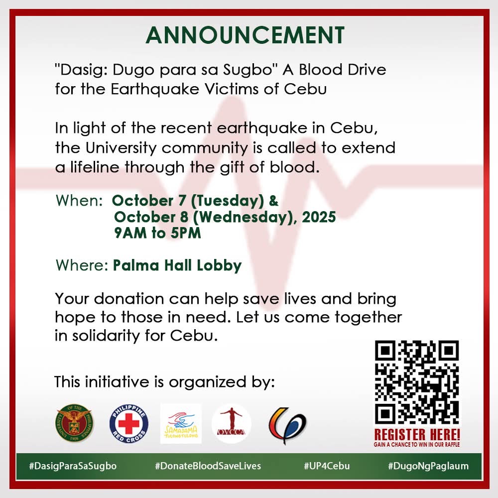 Date: Oct 8 | 9:00 AM - 5:00 PMMakibahagi sa blood donation drive na pinamagatang “Dasig: Dugo para sa Sugbo” sa Oktubre 7 at 8, Martes at Miyerkoles, mula 9 n.u. hanggang 5 n.h., sa Palma Hall Lobby, UP Diliman (UPD).