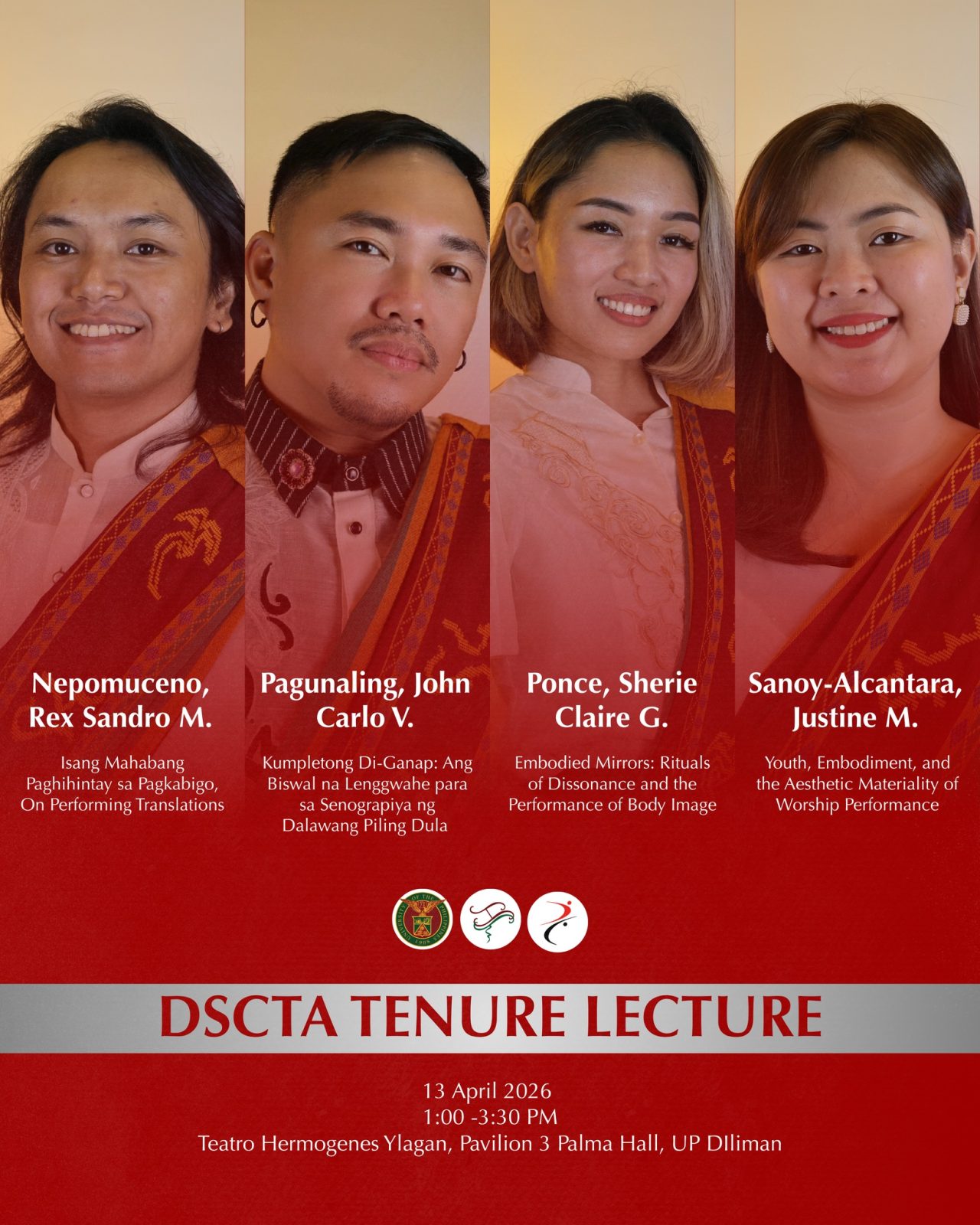 Date: Apr 13 | 12:00 AM - 12:00 AMCatch the UP Diliman (UPD) Department of Speech Communication and Theatre Arts’ (DSCTA) tenure lectures on April 13, Monday, 1:00–3:30 p.m., at the Teatro Hermogenes Ylagan, Pavilion 3, Palma Hall, UPD.