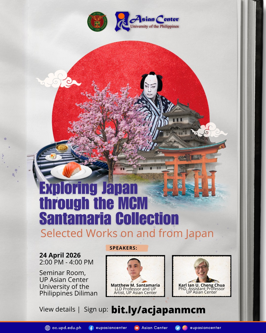 Date: Apr 24 | 2:00 PM - 4:00 PMJoin the book talk “Exploring Japan Through the MCM Santamaria Collection: Selected Works on and From Japan” on April 24, Friday, 2–4 p.m., at the Seminar Room, UP Diliman Asian Center (AC).