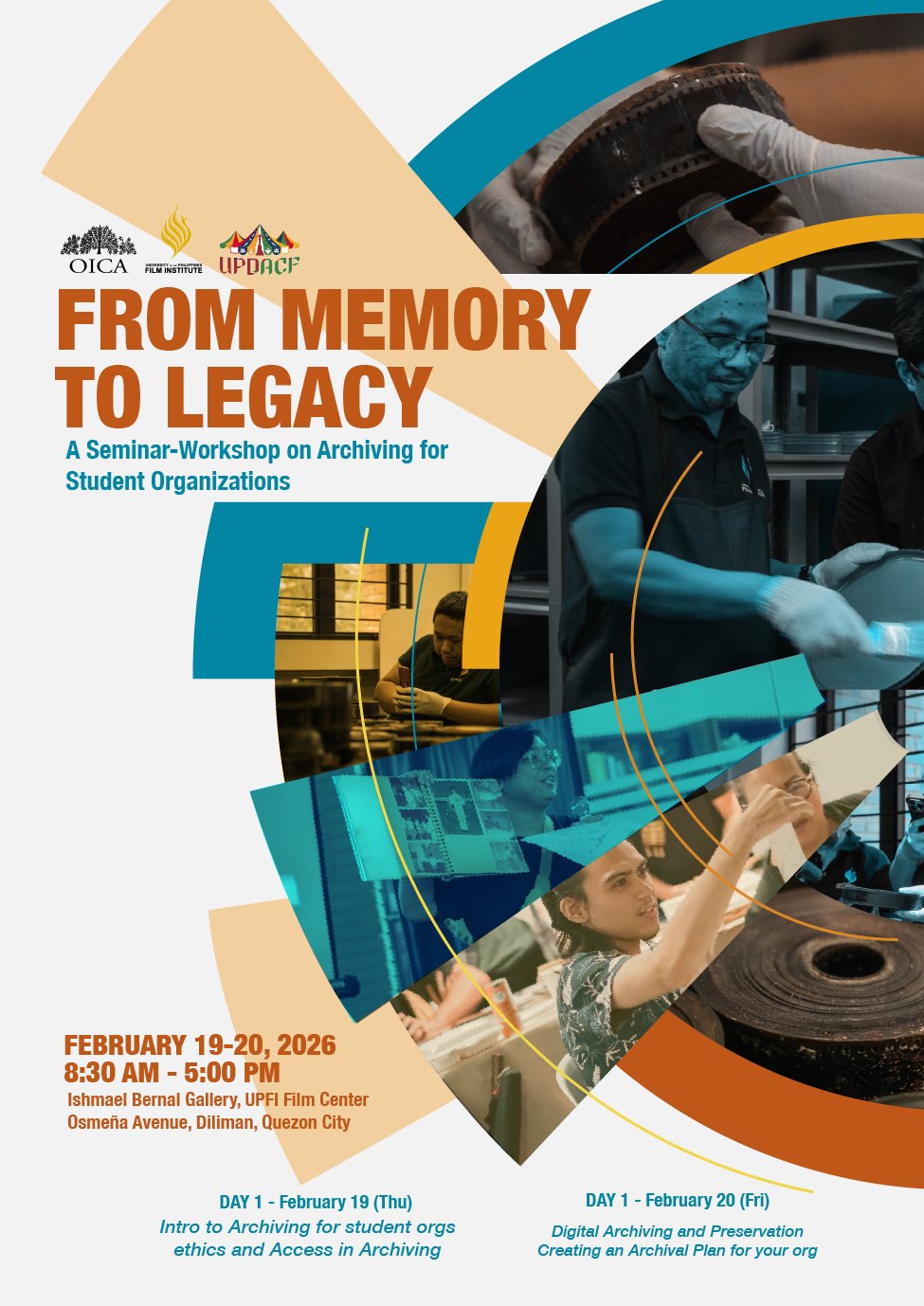 Date: Feb 20 | 8:30 AM - 5:00 PM“From Memory to Legacy: A Seminar-Workshop on Archiving for Student Organizations” will be held on Feb. 19–20, 8:30 a.m.–5:00 p.m., at the Ishmael Bernal Gallery Lobby, UP Film Institute (UPFI) Film Center, Osmeña Avenue, UP Diliman (UPD).