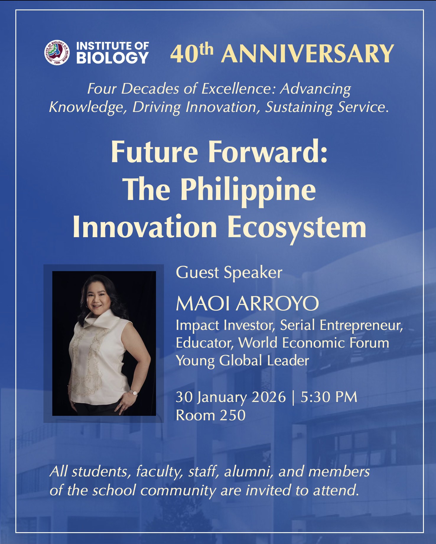 Date: Jan 30 | 5:30 PM - 7:30 PMMembers of the UP community are invited to the lecture “Future Forward: The Philippine Innovation Ecosystem” on Friday, Jan. 30, 5:30 p.m., at Room 250, UP Diliman Institute of Biology (IB).