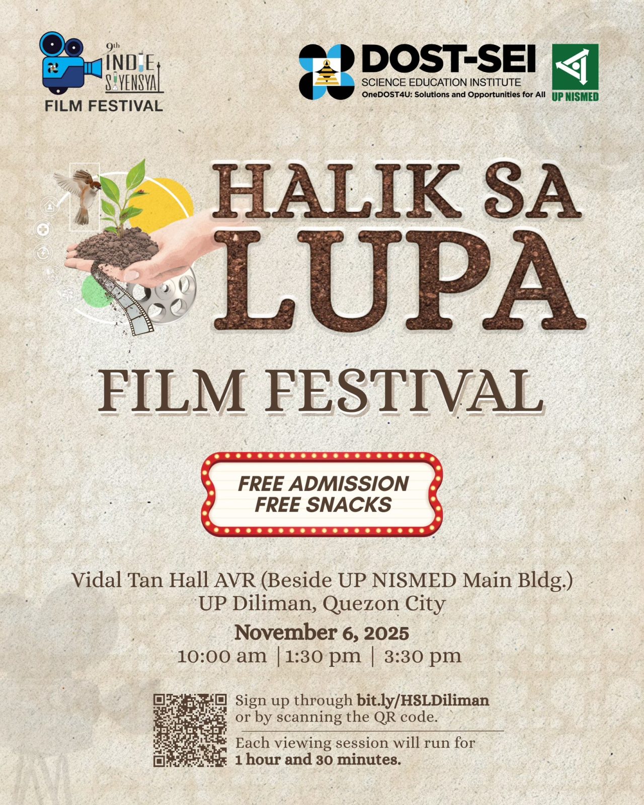 Date: Nov 6 | 10:30 AM - 5:30 PMThe UP Diliman National Institute for Science and Mathematics Education Development (NISMED) invites everyone to the “Halik sa Lupa: 9th Indie-Siyensya Film Festival” on Nov. 6, Thursday, 10:00–11:30 a.m., 1:30–3:00 p.m., and 3:30–5:10 p.m., at the Vidal Tan Hall Audiovisual Room.