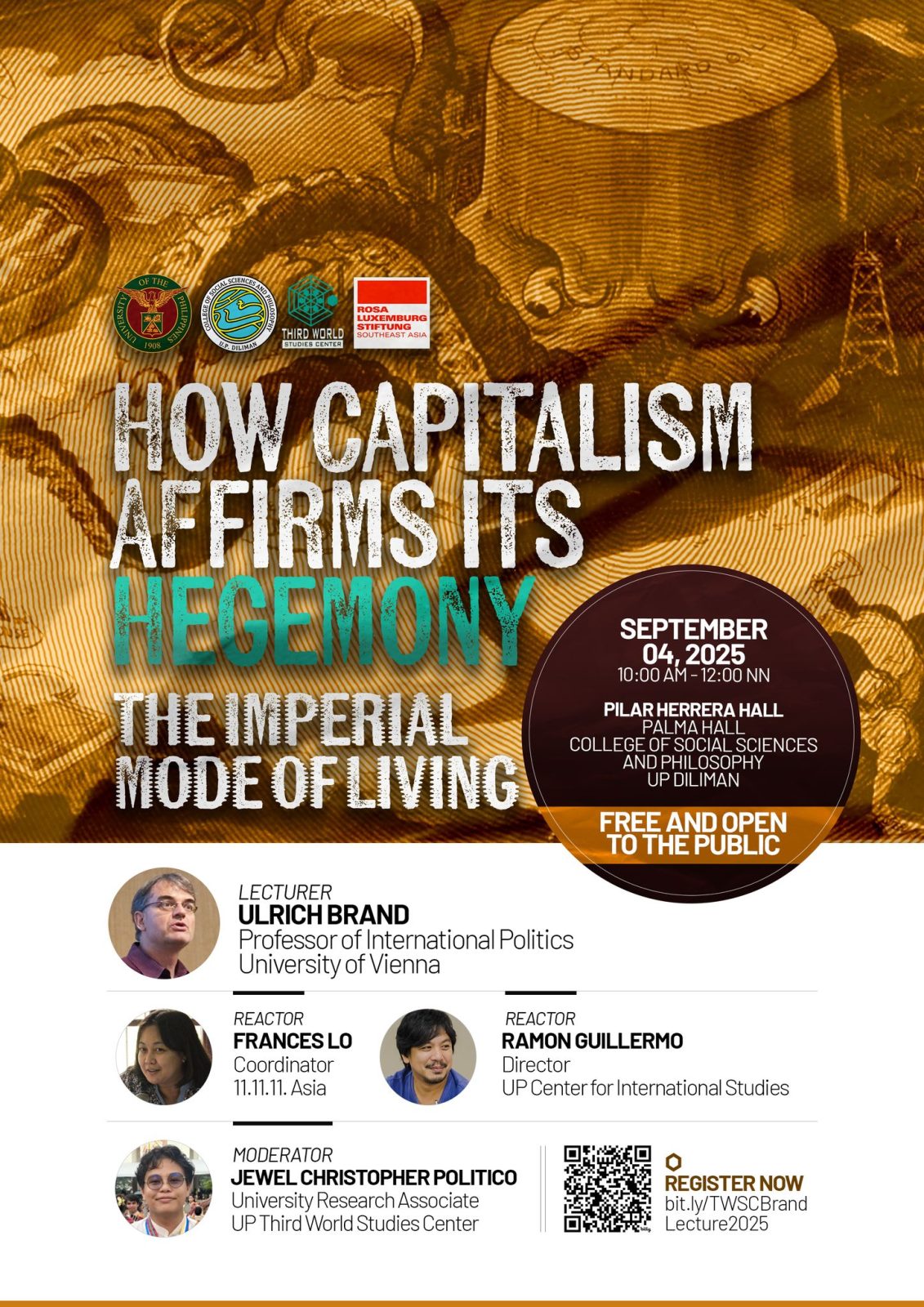 Date: Sep 4 | 10:00 AM - 12:00 PMEveryone is invited to the lecture “How Capitalism Affirms its Hegemony: The Imperial Mode of Living” on Sept. 4, Thursday, 10 a.m.–12 p.m., Pilar Herrera Hall, Palma Hall, UP Diliman (UPD).