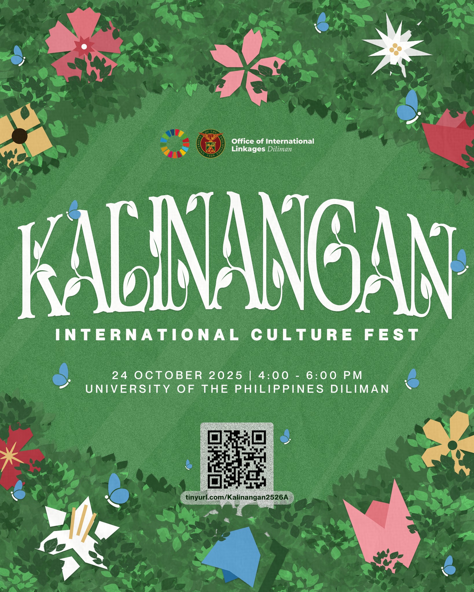 Date: Oct 24 | 4:00 PM - 6:00 PMEveryone is invited to “Kalinangan: International Culture Fest” on Oct. 24, Friday, 4–6 p.m., at UP Diliman (UPD).