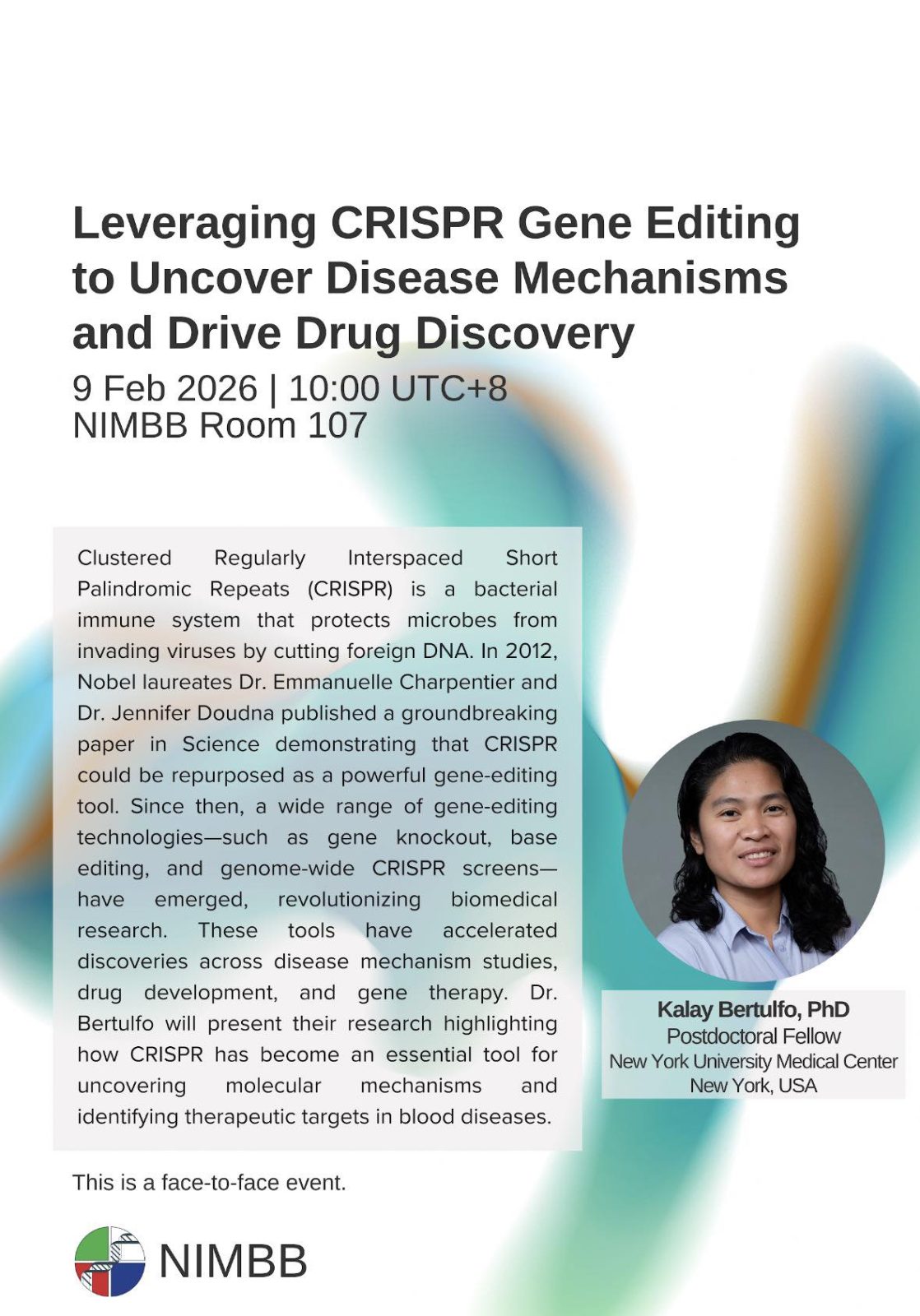 Date: Feb 9 | 10:00 AM - 12:00 PMEveryone is invited to the lecture “Leveraging CRISPR Gene Editing to Uncover Disease Mechanisms and Drive Drug Discovery” by Kalay Bertulfo, PhD on Feb. 9, Monday, 10 a.m., at Room 107, UP Diliman National Institute of Molecular Biology and Biotechnology.
