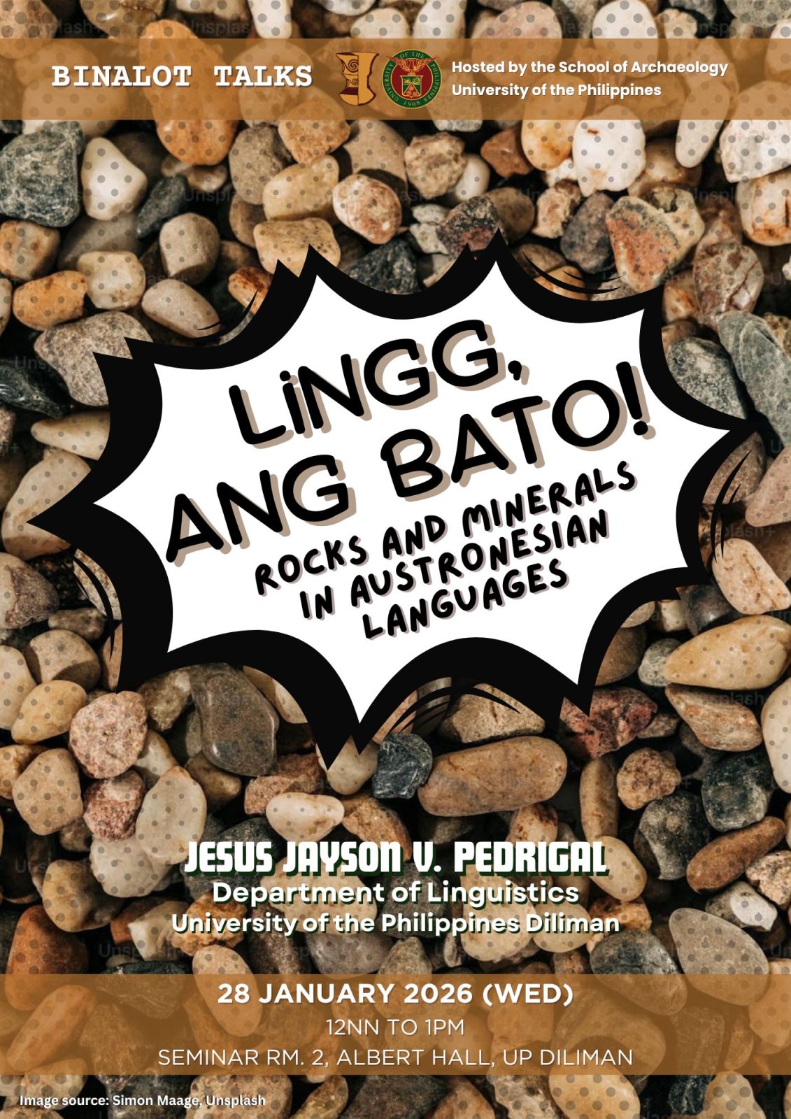 Date: Jan 28 | 12:00 PM - 1:00 PMCatch the Binalot Talks “Lingg, Ang Bato!: Rocks and Minerals in Austronesian Languages” on Jan. 28, 12–1 p.m., at the Seminar Room 2, Albert Hall, UP Diliman (UPD) School of Archaeology (SA).
