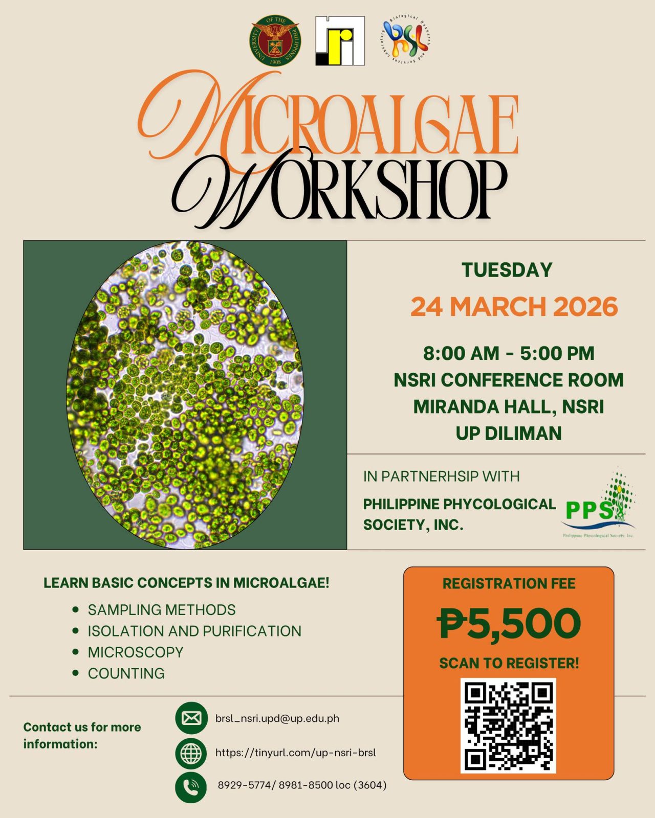 Date: Mar 24 | 8:00 AM - 5:00 PMThe Biological Research and Services Laboratory of the UP Diliman Natural Sciences Research Institute (NSRI) will conduct the “Microalgae Workshop” on March 24, 8 a.m.–5 p.m., at the NSRI Conference Room, Miranda Hall.