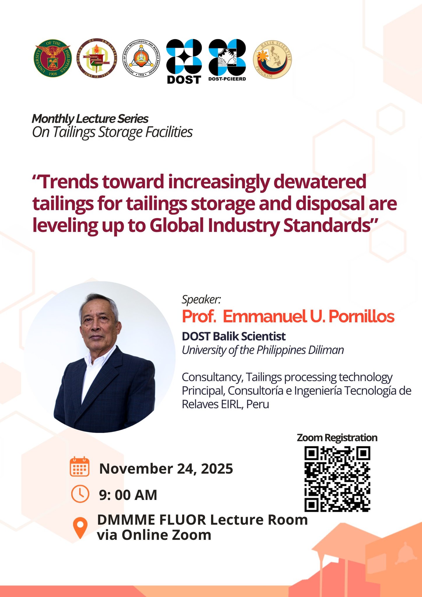 Date: Nov 24 | 9:00 AM - 12:00 PMDon’t miss the third installment of the “Monthly Lecture Series on Tailings Storage Facilities” of the UP Diliman Department of Mining, Metallurgical, and Materials Engineering (DMMME) on Monday, Nov. 24, 9 a.m., at the Fluor Lecture Room, DMMME and via Zoom.