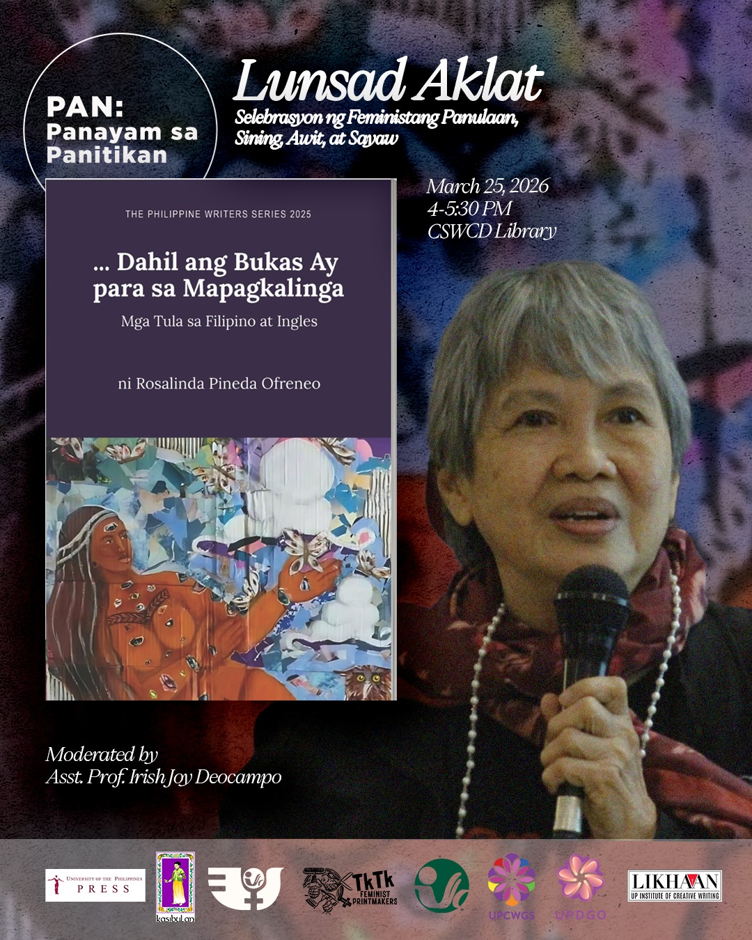 The event is organized by the UPD Institute of Creative Writing and the Department of Women and Development Studies, in partnership with the CSWCD, UP Center for Women’s and Gender Studies, and UPD Gender Office.