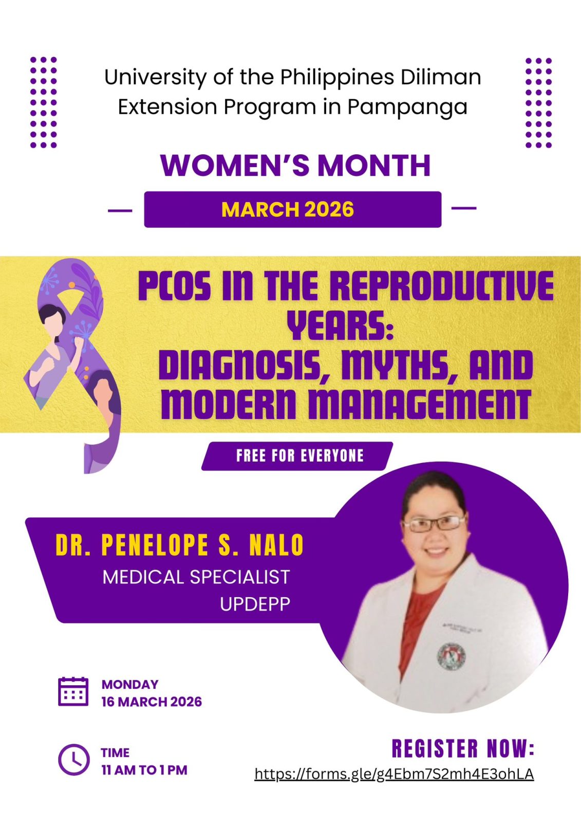 Date: Mar 16 | 11:00 AM - 1:00 PMThe UP Diliman Extension Program in Pampanga (UPDEPP) Gender Office invites everyone to the webinar “PCOS in the Reproductive Years: Diagnosis, Myths, and Modern Management” on March 16, Monday, from 11 a.m. to 1 p.m. via Zoom.