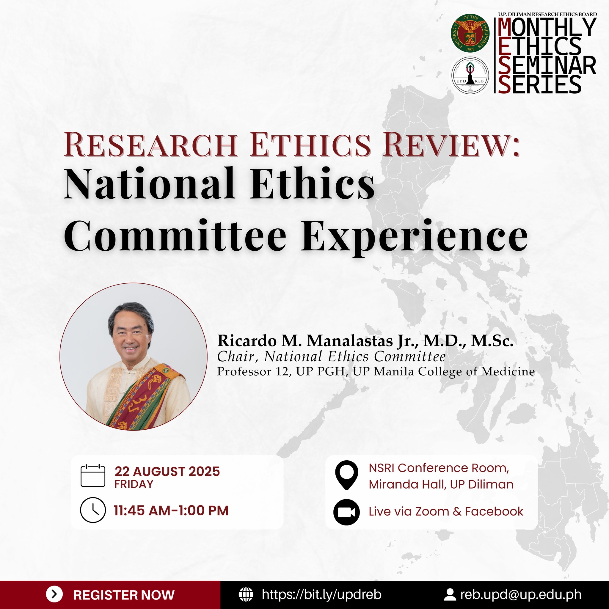 Date: Aug 22 | 11:45 AM - 1:00 PMEveryone is invited to the seminar “Research Ethics Review: National Ethics Committee Experience” on Aug. 22, Friday, 11:45 a.m.–1:00 p.m., at the UP Diliman (UPD) Natural Sciences Research Institute and via Zoom and Facebook Live.