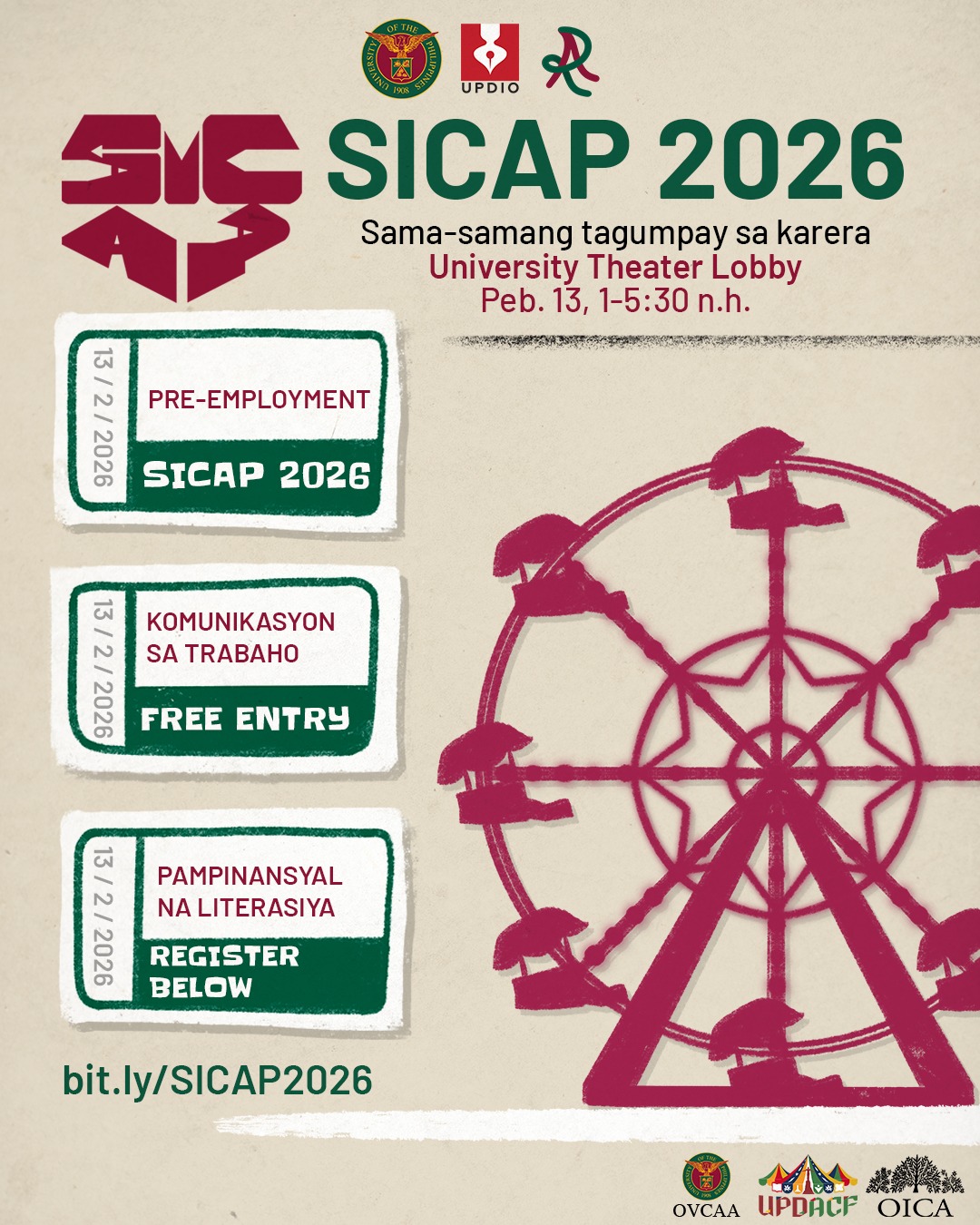 Ang SICAP o “Serbisyo sa Iskolar: Career Applications and Preparation 2026” ay “isa sa mga palihan na kabilang sa mga programa ng UPD Office for Initiatives in Culture and the Arts (OICA) para sa ‘UPD Arts and Culture Festival 2026.’”