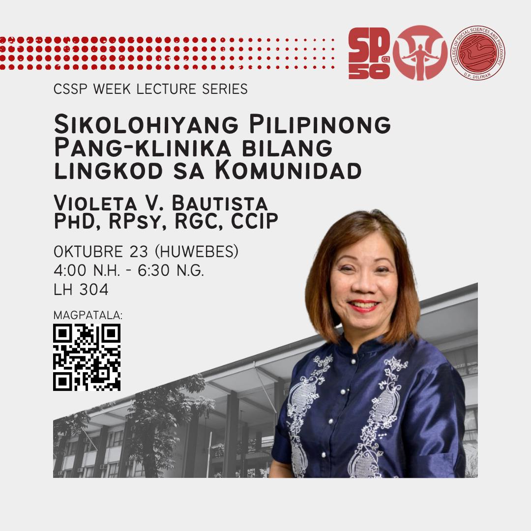 Date: Oct 23 | 4:00 PM - 6:30 PMTunghayan ang panayam na “Sikolohiyang Pilipinong Pang-klinika bilang Lingkod sa Komunidad” sa Oktubre 23, Huwebes, 4:00 n.h.–6:30 n.g., sa Room 304, Lagmay Hall, UP Diliman (UPD).
