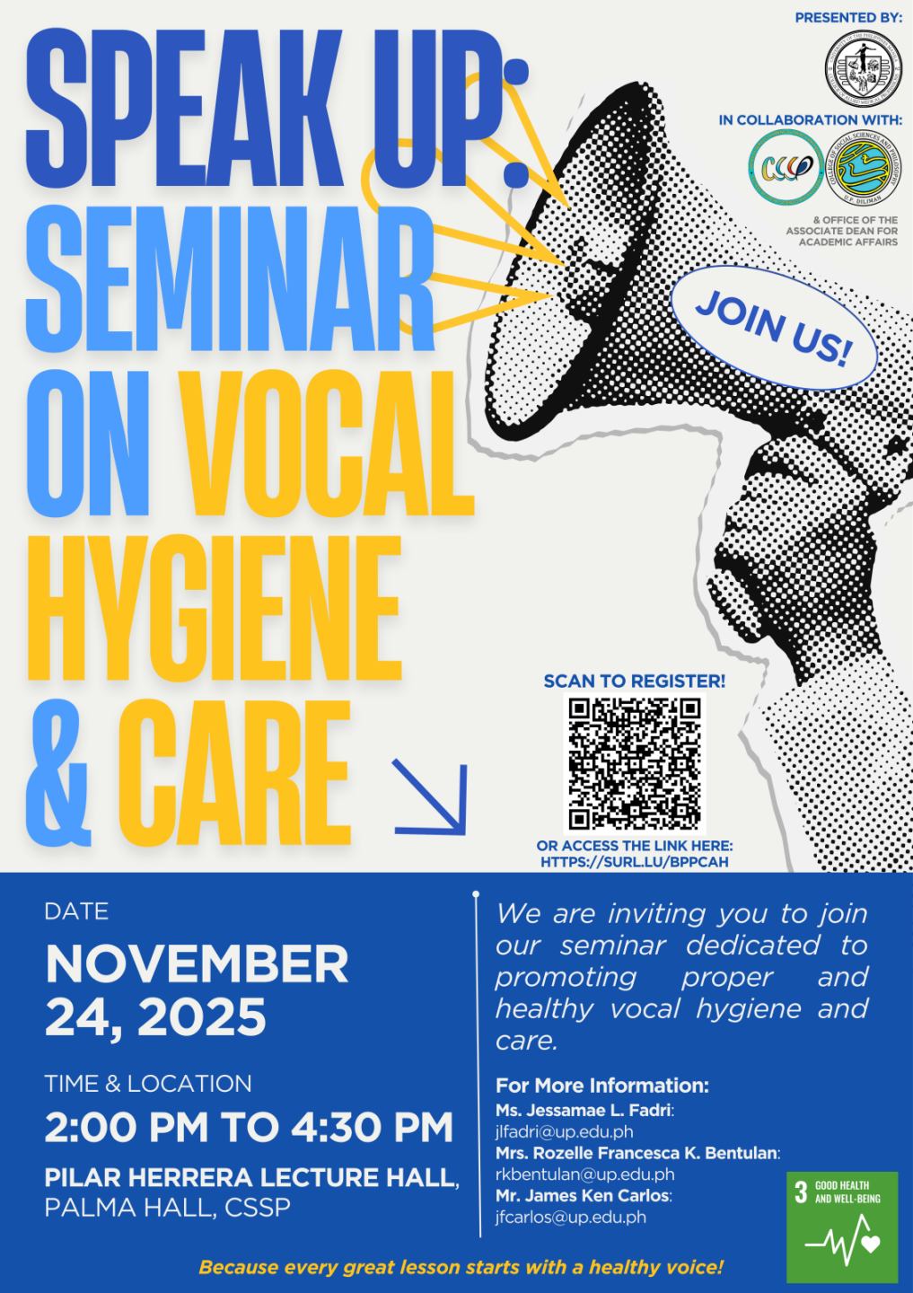 Date: Nov 24 | 2:00 PM - 4:30 PMJoin the “Speak UP: Seminar on Vocal Hygiene and Care” on Nov. 24, Monday, 2:00–4:30 p.m., at the Pilar Herrera Lecture Hall, Palma Hall, UP Diliman (UPD).