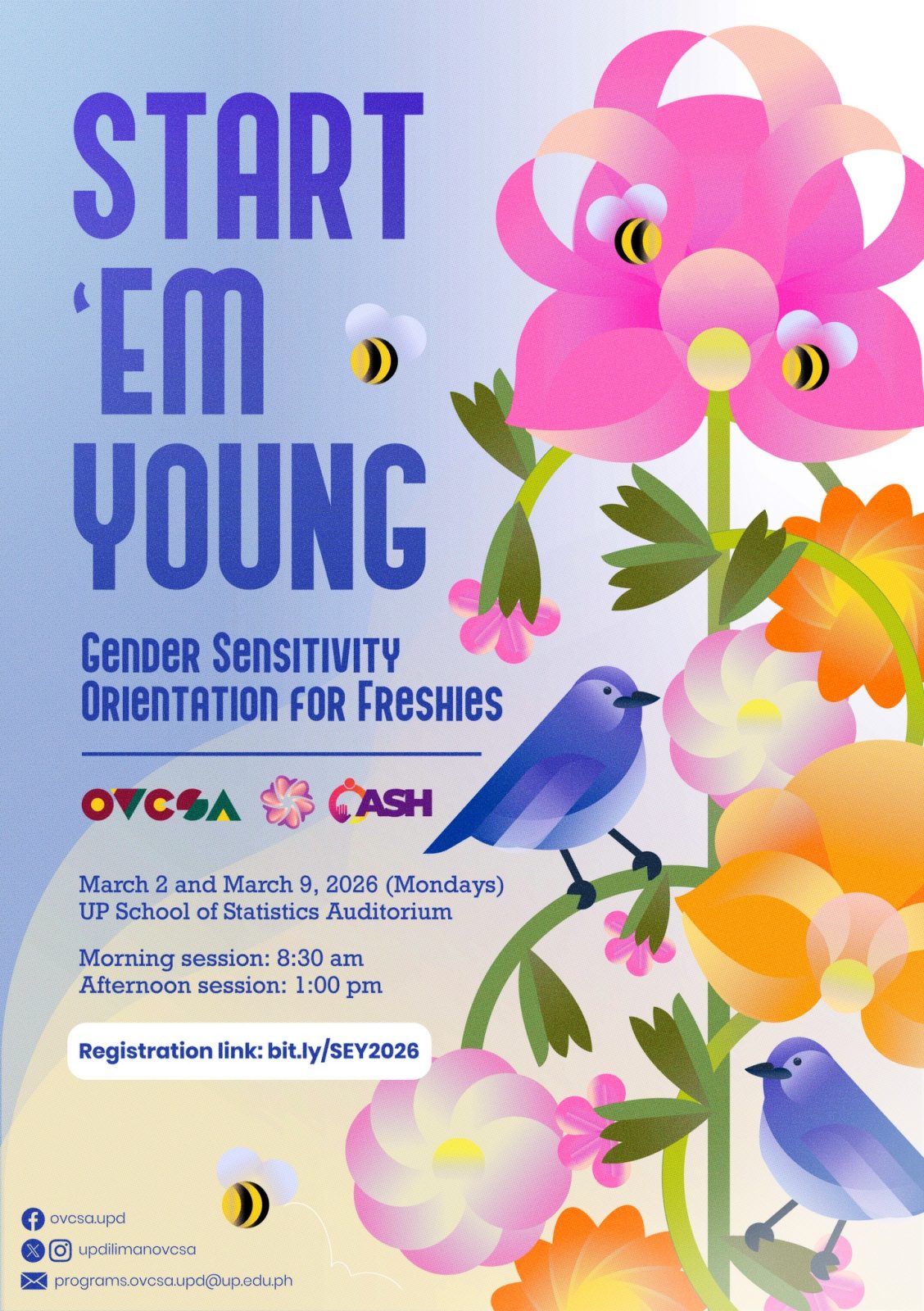 Date: Mar 9 | 8:30 AM - 4:00 PMThe “Start ‘Em Young: Gender Sensitivity Orientation for Freshies” will be held on March 2 and 9, Mondays, 8:30 a.m.–12:00 p.m. and 1:00–4:30 p.m., at the UP Diliman (UPD) School of Statistics Auditorium.