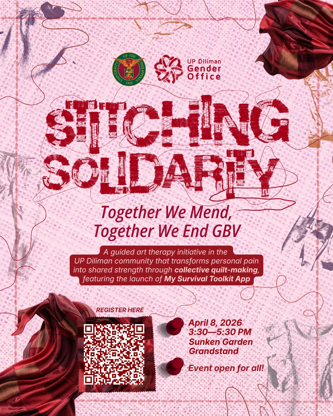 Date: Apr 8 | 3:30 PM - 5:30 PMMakilahok sa “Stitching Solidarity: Together We Mend, Together We End GBV (Gender-Based Violence)” ng UP Diliman Gender Office (DGO) bukas, Abril 8, 3:30–5:30 p.m., sa Sunken Garden Grandstand, UPD.