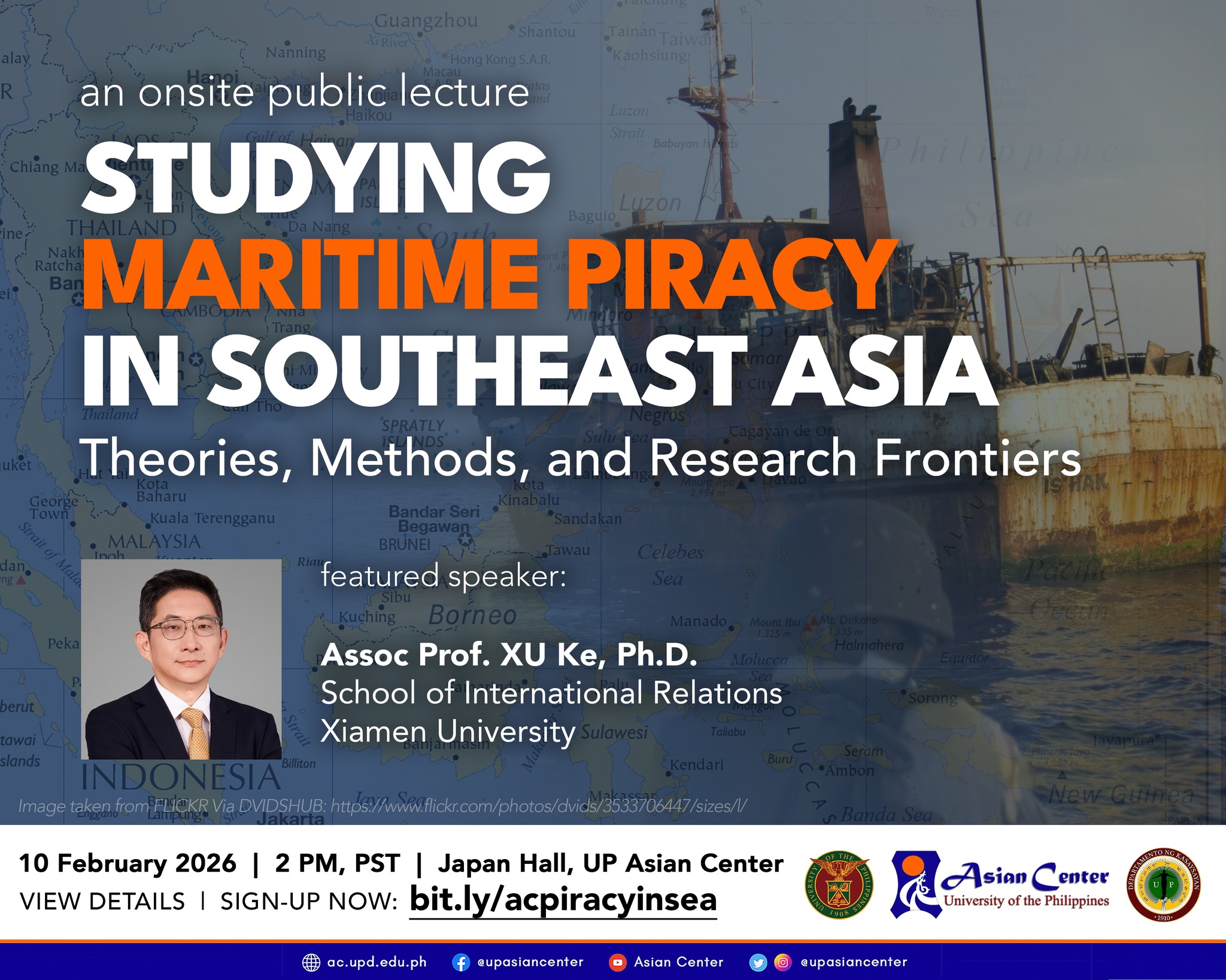 Date: Feb 10 | 2:00 PM - 4:00 PMEveryone is invited to the public lecture “Studying Maritime Piracy in Southeast Asia: Theories, Methods, and Research Frontiers” on Feb. 10, Tuesday, 2 p.m., at the Japan Hall, UP Diliman (UPD) Asian Center (AC).