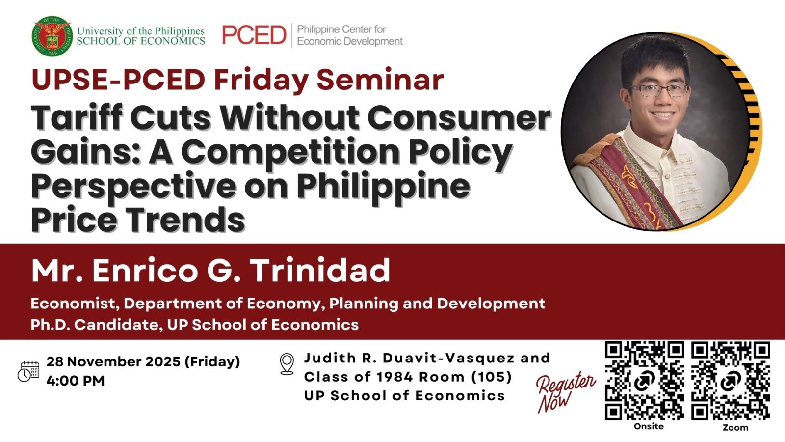 Date: Nov 28 | 4:00 PM - 6:00 PMDon’t miss the seminar “Tariff Cuts Without Consumer Gains: A Competition Policy Perspective on Philippine Price Trends” on Friday, Nov. 28, 4 p.m., at Room 105, Judith R. Duavit-Vasquez and Class of 1984 Lecture Room, UP Diliman School of Economics (SE) and via Zoom.