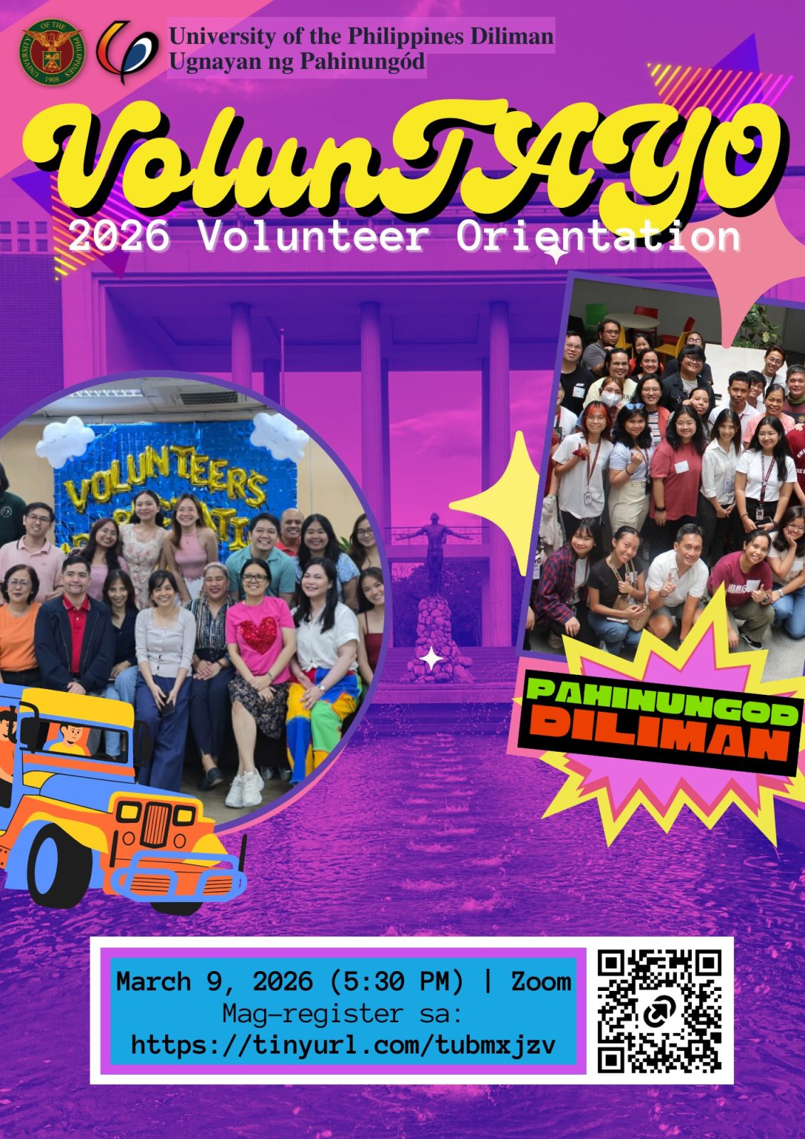 Date: Mar 9 | 5:30 PM - 6:30 PMInaanyayahan ng UP Diliman Ugnayan ng Pahinungod ang mga dati o aktibong volunteers na sumali sa “VolunTayo 2026: Volunteer Orientation” na gaganapin sa Marso 9, Lunes, 5:30 n.h. sa pamamagitan ng Zoom.