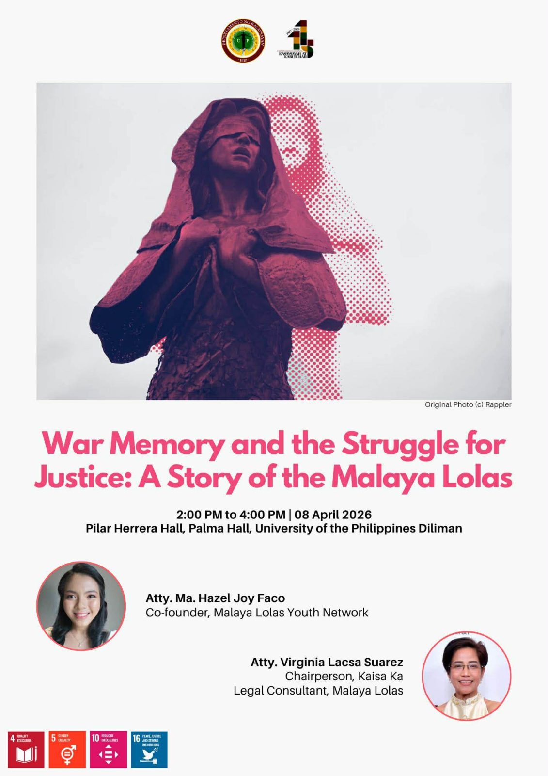 Date: Apr 8 | 2:00 PM - 4:00 PMTunghayan ang panayam na “War Memory and the Struggle for Justice: A Story of the Malaya Lolas” na gaganapin bukas, Abril 8, 2–4 n.h., sa Pilar Herrera Lecture Hall, Palma Hall, UP Diliman (UPD).