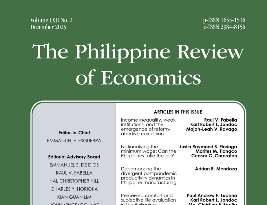 The articles are Income Inequality, Weak Institutions, and the Emergence of Reform-Abortive Corruption by Raul V. Fabella, Karl Robert L. Jandoc, and Majah Leah V. Ravago; Nationalizing the Minimum Wage: Can the Philippines Take the Toll? by Justine Raymond S. Eloriaga, Marites M. Tiongco, and Caesar C. Cororaton; Decomposing the Divergent Post Pandemic Productivity Dynamics in Philippine Manufacturing by Adrian R. Mendoza; Perceived Comfort and Subjective Life Evaluation in the Philippines: Evidence from a National Visioning Exercise by Paul Andrew F. Lucena, Karl Robert L. Jandoc, and Ma. Christina F. Epetia; 2025 Nobel Memorial Prize in Economics: Joel Mokyr by Emmanuel S. de Dios; and A stylized Version of the Aghion-Howitt Growth Model by Delano S. Villanueva.