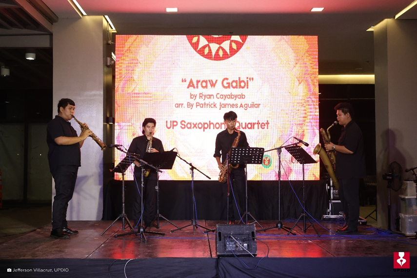 The UP Saxophone Quartet followed, performing Araw-Gabi, music and lyrics by National Artist for Music Ryan Cayabyab, arranged for saxophone quartet by Patrick James Aguilar, and Beautiful Girl, music and lyrics by Jose Mari Chan, arranged for saxophone quartet by Michael Mark Guevarra.
